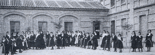 Las primeras fotos de las colegialas nos muestran un elegante uniforme negro, largo hasta los tobillos, con lazo blanco en el cuello, canesú y cinturón ribeteado de blanco, como también en los puños de las largas mangas holgadas. Como calzado, botines oscuros. El pelo lo llevaban recogido en un moño. Como abrigo, usaban una capa. Por su parte, las pequeñas del colegio tenían un uniforme más corto que las mayores. Toda una lección de elegancia.