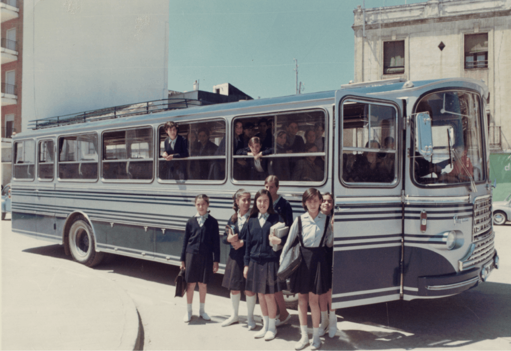 En esa misma década de 1950 apareció un nuevo uniforme. Se trataba de un pichi azul marino, cruzado con cuatro botones, y con camisa blanca. Llevaban una corbata con rayas azul marino y gris plata. La franja gris era más grande que la azul marino y brillaba por ser de seda. El cinturón era de cuero con hebilla y los zapatos, marrones y de la marca Gorila. Las telas para hacer el uniforme se vendían en el colegio y así se conseguía que fueran todas iguales. En la fiesta de la Niña María llevaban velo y guantes blancos.