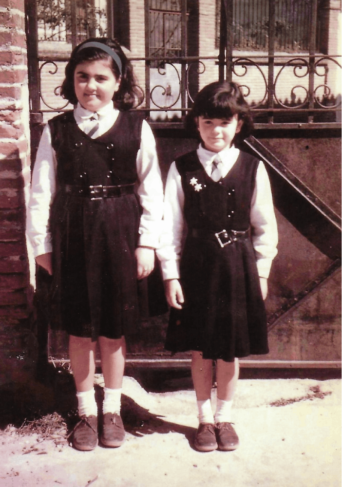 María Ángeles y María José Morales Arriero en el patio de entrada del colegio.