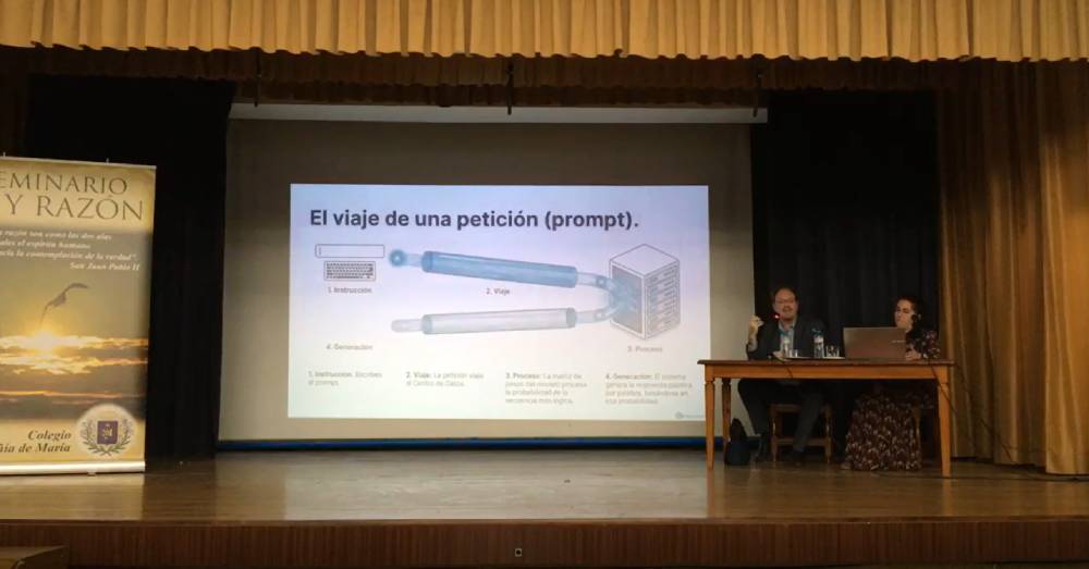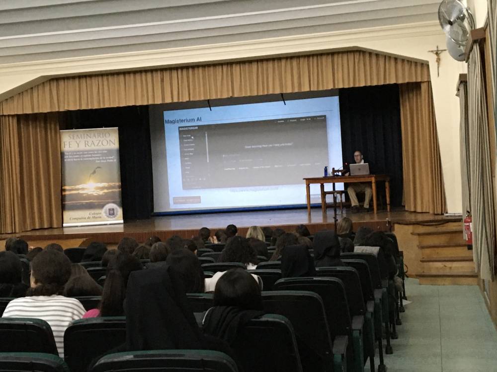 D. Enrique Pelayo, ingeniero en tecnologías electrónicas, expuso el riesgo de general alucinaciones digitales en las IAs y los medios que se están empleando para evitarlas. Nos mostró cómo al hablar de temas de fe católica las IAs cometen muchos fallos y explicó cómo Magisterium AI es una IA fiable en este tema por su sistema de corrección de errores.